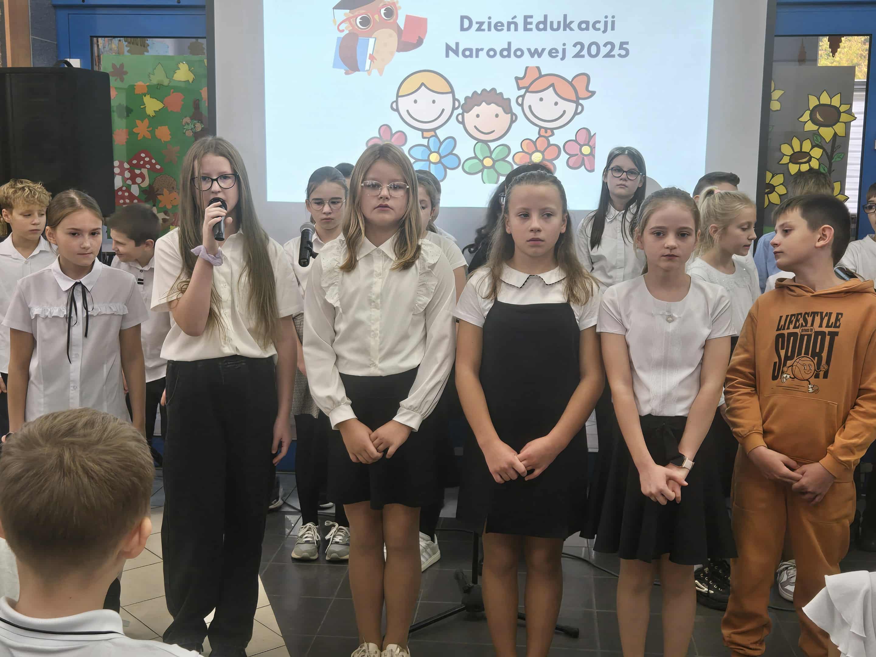 16 października 2025r. odbył się uroczysty apel z okazji Dnia Edukacji Narodowej przygotowany przez uczniów klas drugich. Uczniowie w niezwykle ciekawy i pełen humoru sposób przedstawili krótkie lekcje o cechach wspaniałego nauczyciela, pokazując, że najlepszy pedagog to ten, który uczy z sercem, cierpliwością i uśmiechem. W dalszej części uroczystości dzieci przybliżyły historię tego wyjątkowego święta, przypominając wszystkim, dlaczego właśnie tego dnia obchodzimy Dzień Edukacji Narodowej. Nie zabrakło również aktywnego udziału widowni – uczniowie i nauczyciele mogli sprawdzić swoją wiedzę w quizie z zagadkami dotyczącymi szkoły. Za poprawne odpowiedzi uczestnicy otrzymywali słodkie nagrody ufundowane przez Samorząd Uczniowski klas 1–3.