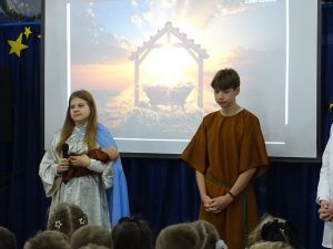 Jasełka przygotowane przez klasy szóste wprowadziły naszą szkołę w magiczny czas Bożego Narodzenia już 17 grudnia. Przedstawienie pt.: Jasełka XXI wieku najpierw obejrzeli uczniowie klas 1-3, a następnie starsza część społeczności szkolnej. W treści wystąpienia tradycja przenikała się ze współczesnością. Nasi aktorzy w sposób humorystyczny pokazali jak by się mogło odbyć przyjęcie nowonarodzonego Chrystusa w obecnych czasach, pełnych urządzeń elektronicznych oraz mediów społecznościowych. Kolejny raz uczniowie udowodnili, że w naszej szkole nie brakuje wspaniałych talentów. Stroje, muzyka a przede wszystkim wrażliwość oraz zaangażowanie młodych aktorów wspaniale objawiły się w przedstawieniu. Zawarte w programie treści religijne przeplatane kolędami oraz pastorałkami wytworzyły niepowtarzalny nastrój.